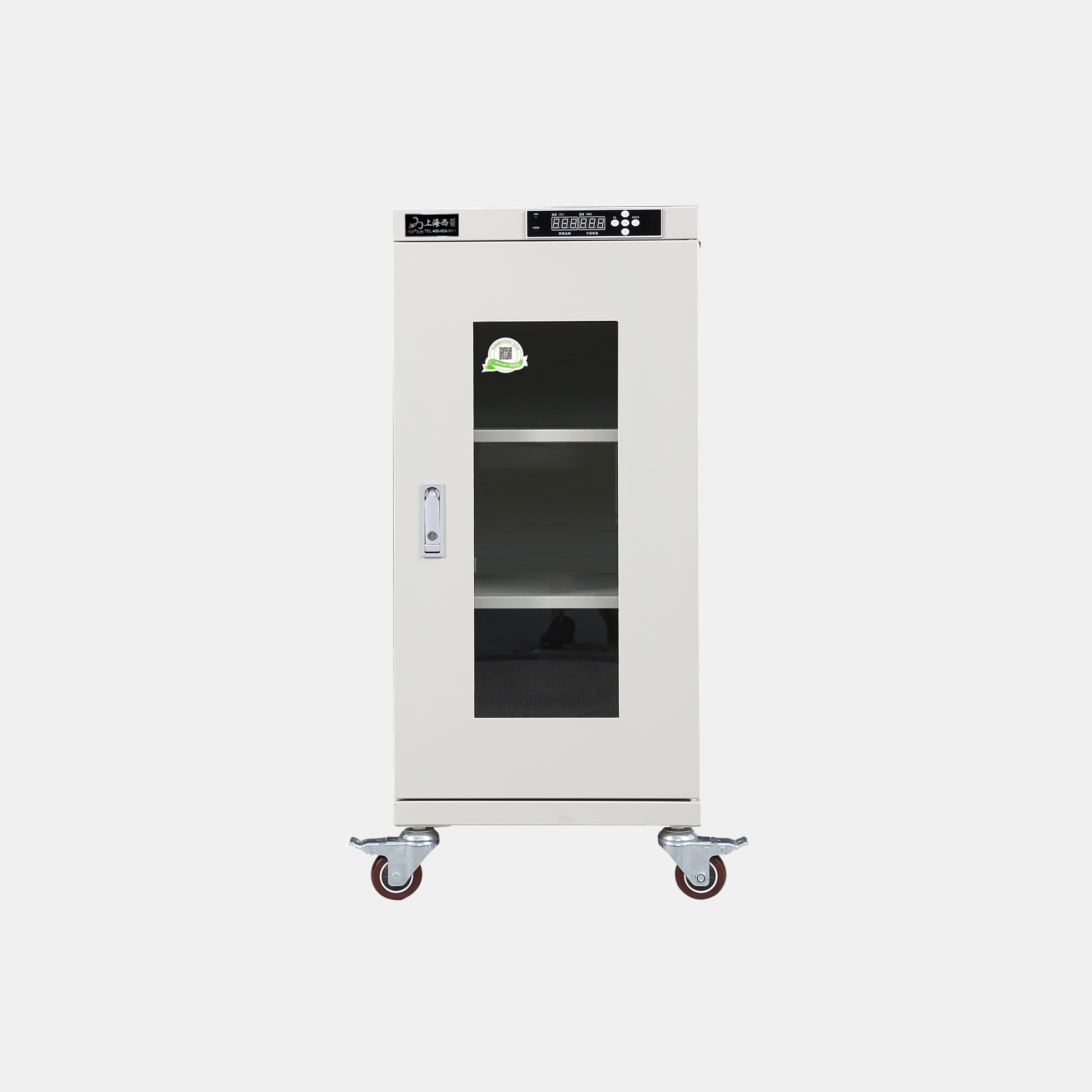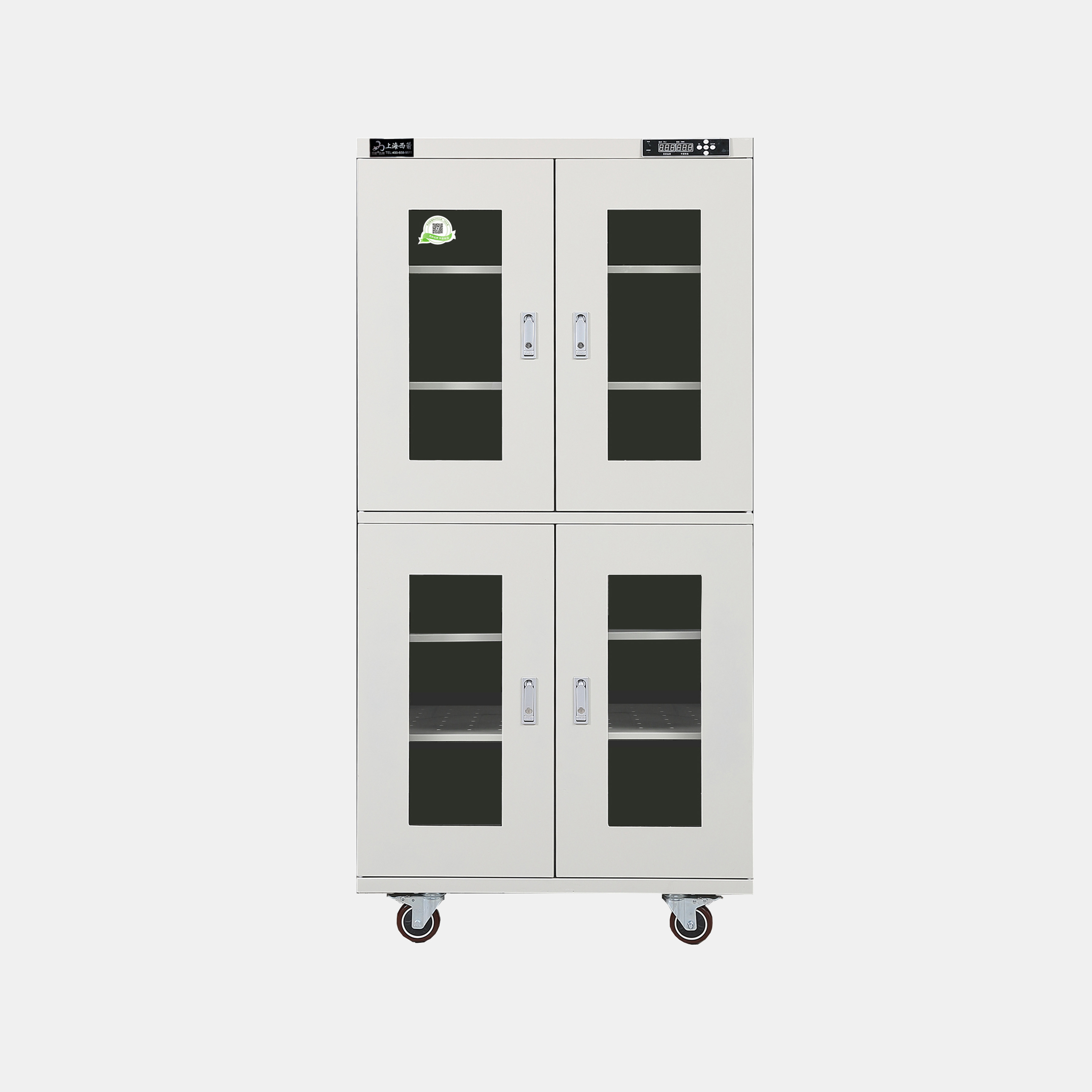 3.防潮箱門玻璃區(qū)域選用3.0mm鋼化玻璃,防前傾耳式結(jié)構(gòu)設(shè)計。帶平面加壓把手鎖*體化設(shè)計,有防盜功能。**部安裝可移動帶剎車腳輪方便移動及固定(防靜電機型腳輪為防靜電)。